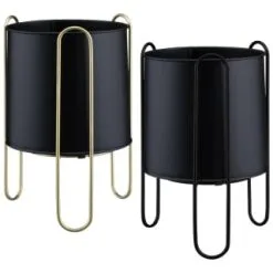 B&M Leaf Embossed Planter On Gold Stand – Black